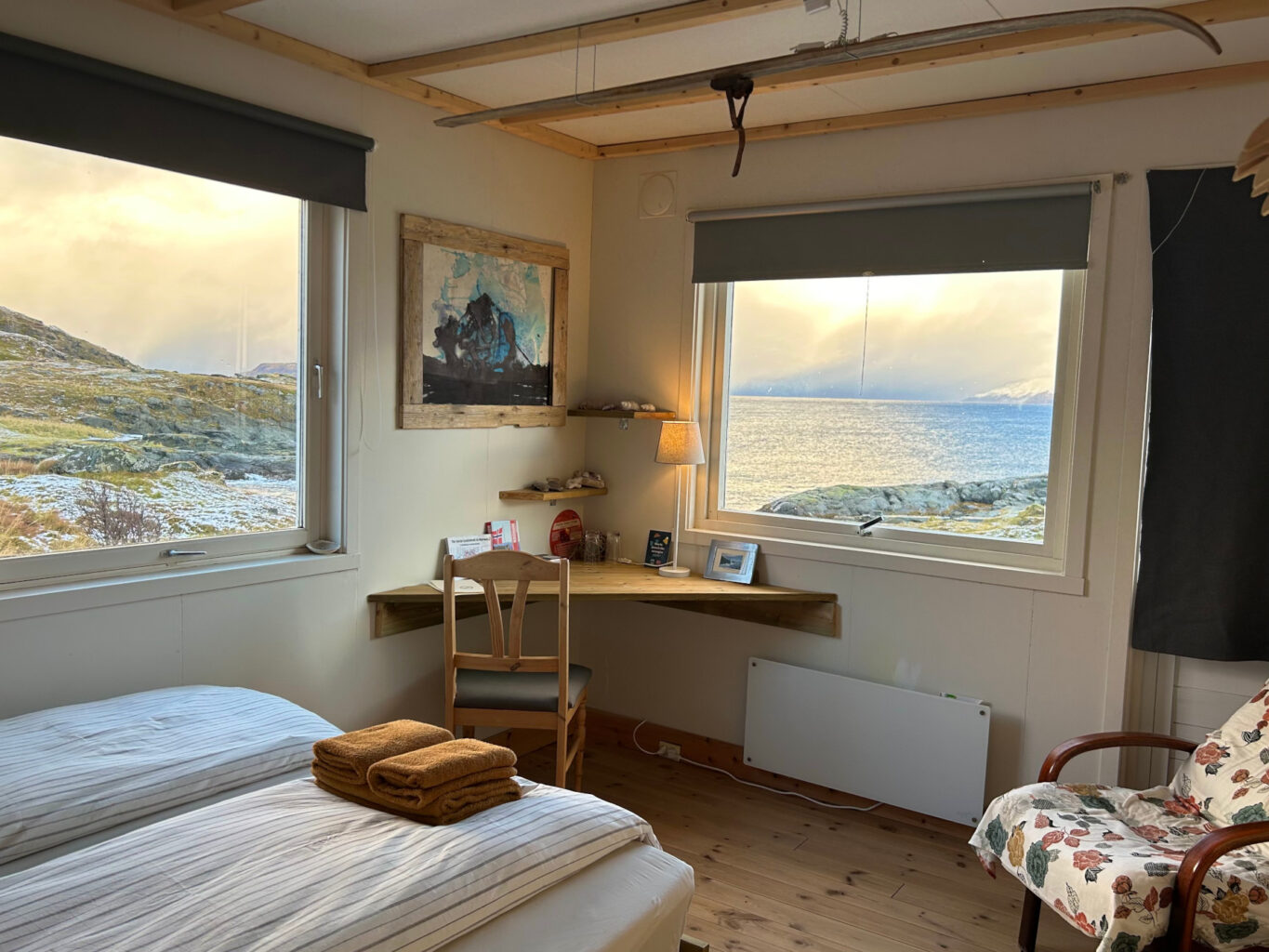 The Northwest, a corner double room with views of the ocean and northern lights, writing table, double bed and balcony.